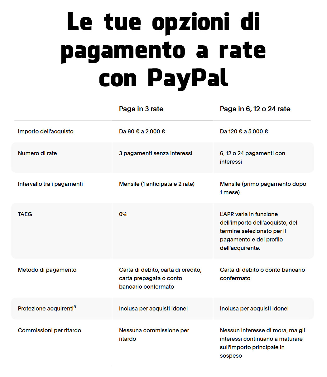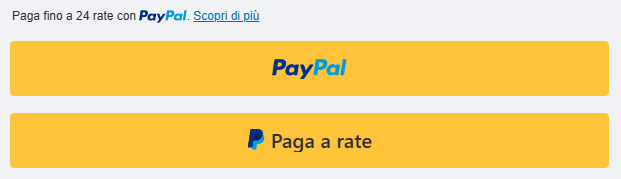 Il pagamento in 6 – 12 – 24 rate con PayPal è utilizzabile per carrelli di acquisto idonei di valore compreso tra €.120 e €.5000 , il pagamento rateale viene disposto esclusivamente da PayPal la quale è l’unica a poter decidere se concedere e accettare questo metodo di pagamento.