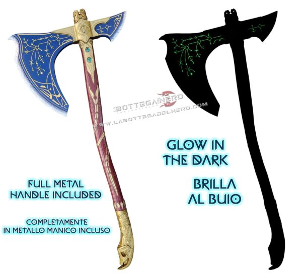 Il manico anch’esso interamente in metallo garantisce solidità e realismo, arricchito da eleganti finiture dorate e venature che evocano il legno incantato del Leviatano. La combinazione cromatica tra blu profondo, oro e argento mette in risalto ogni dettaglio, valorizzando le decorazioni scolpite e le gemme incastonate lungo la struttura.