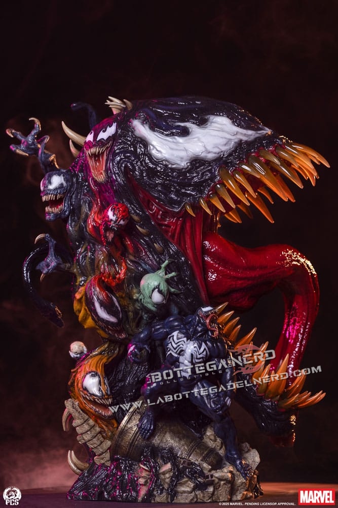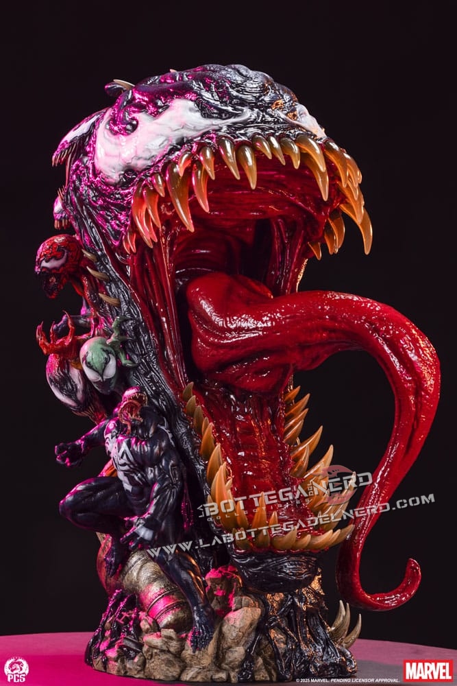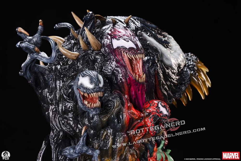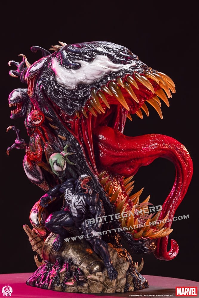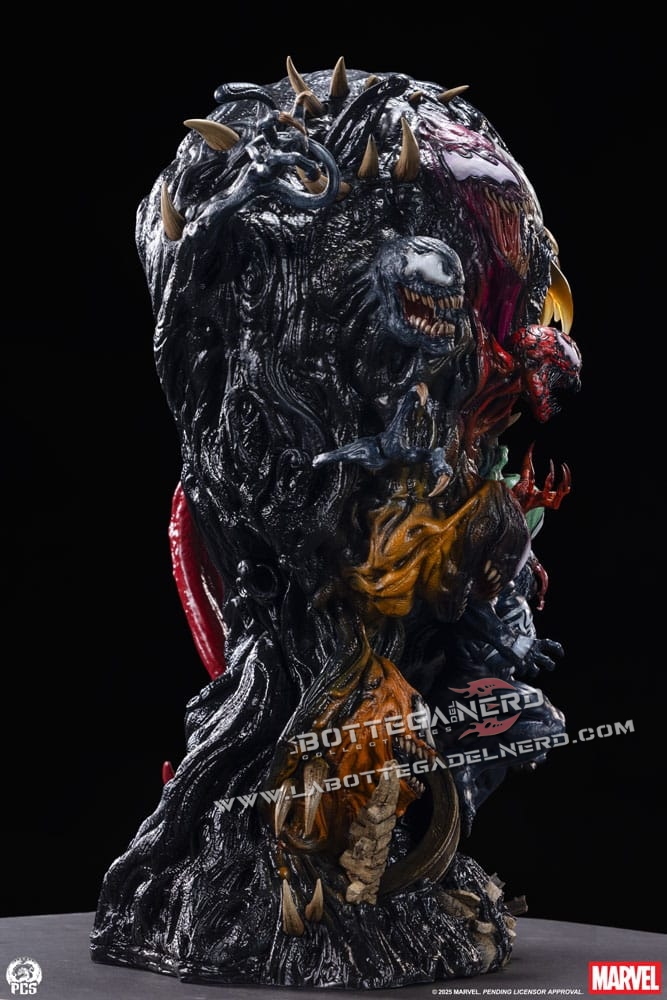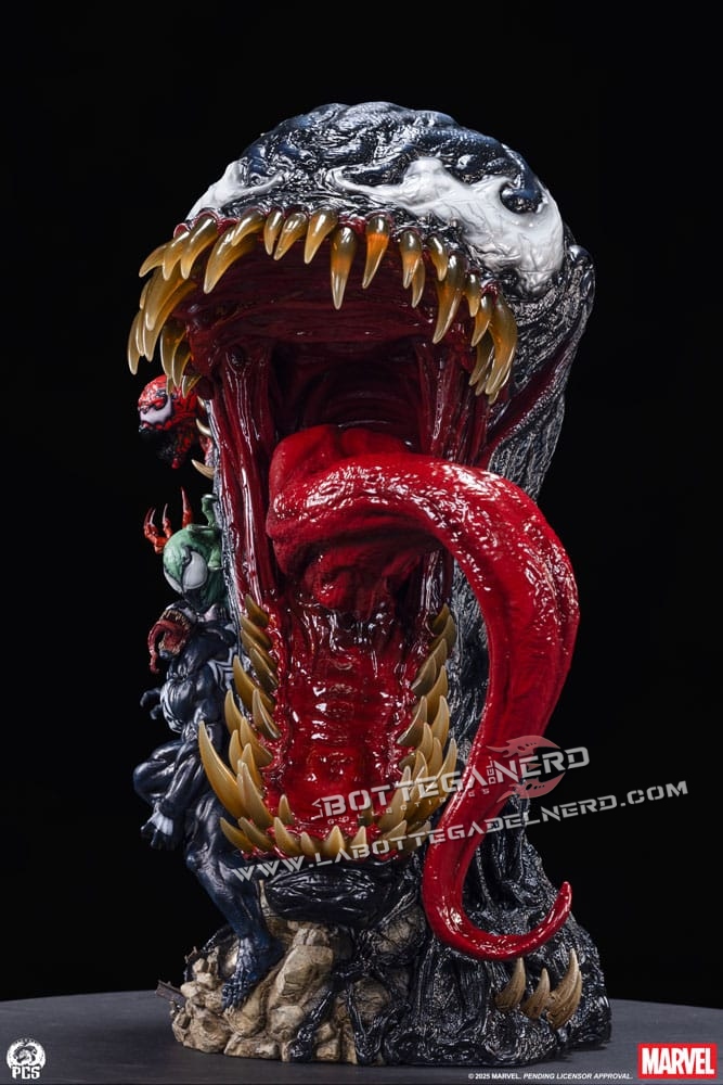 Al centro della scena si erge Venom, il famigerato anti eroe con la bocca spalancata in un urlo mostruoso, tra denti aguzzi e la lingua rossa che si protende minacciosa. Intorno a lui, un’incredibile composizione artistica rappresenta alcuni dei simbionti più celebri della saga: Carnage, Lasher, Scream, Phage, Riot e Agony, uniti in un vortice di materia aliena che circonda la base del busto. L’intera opera è completata da un’enorme campana, simbolo del punto debole del simbionte verso le onde sonore, che funge da trono scenografico per questo capolavoro.