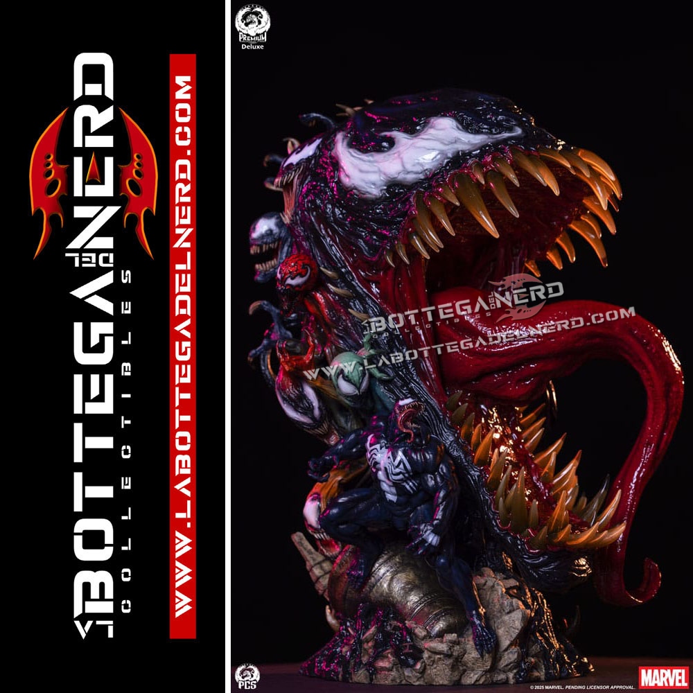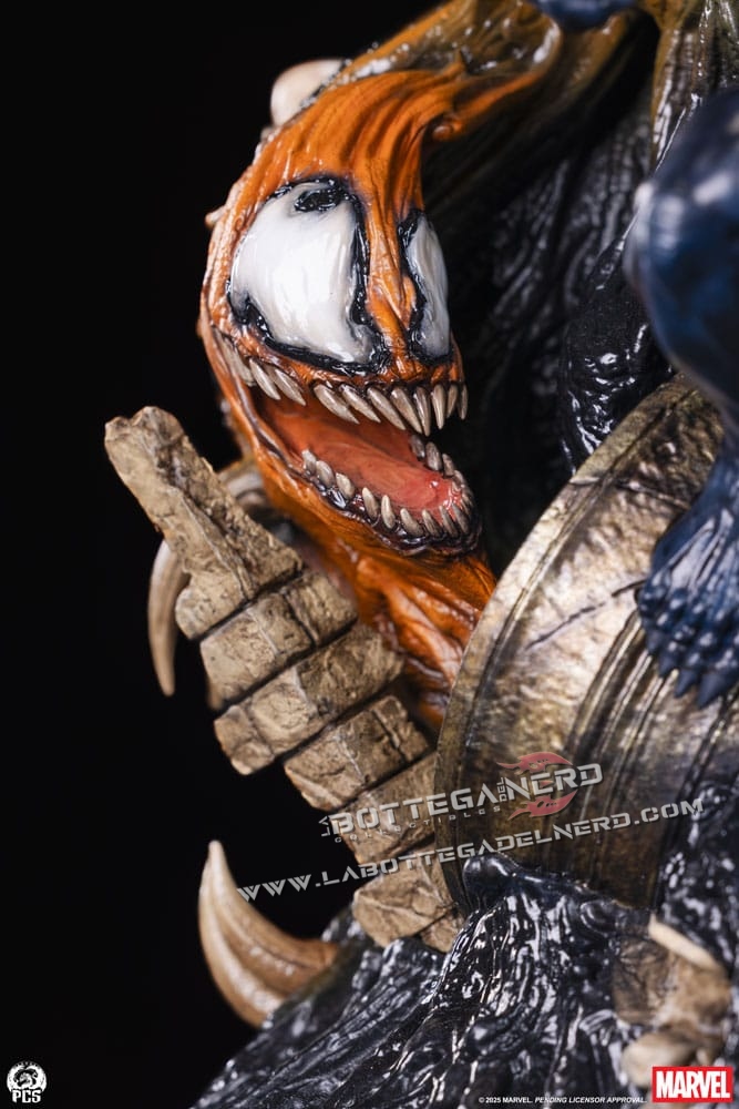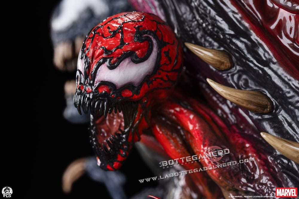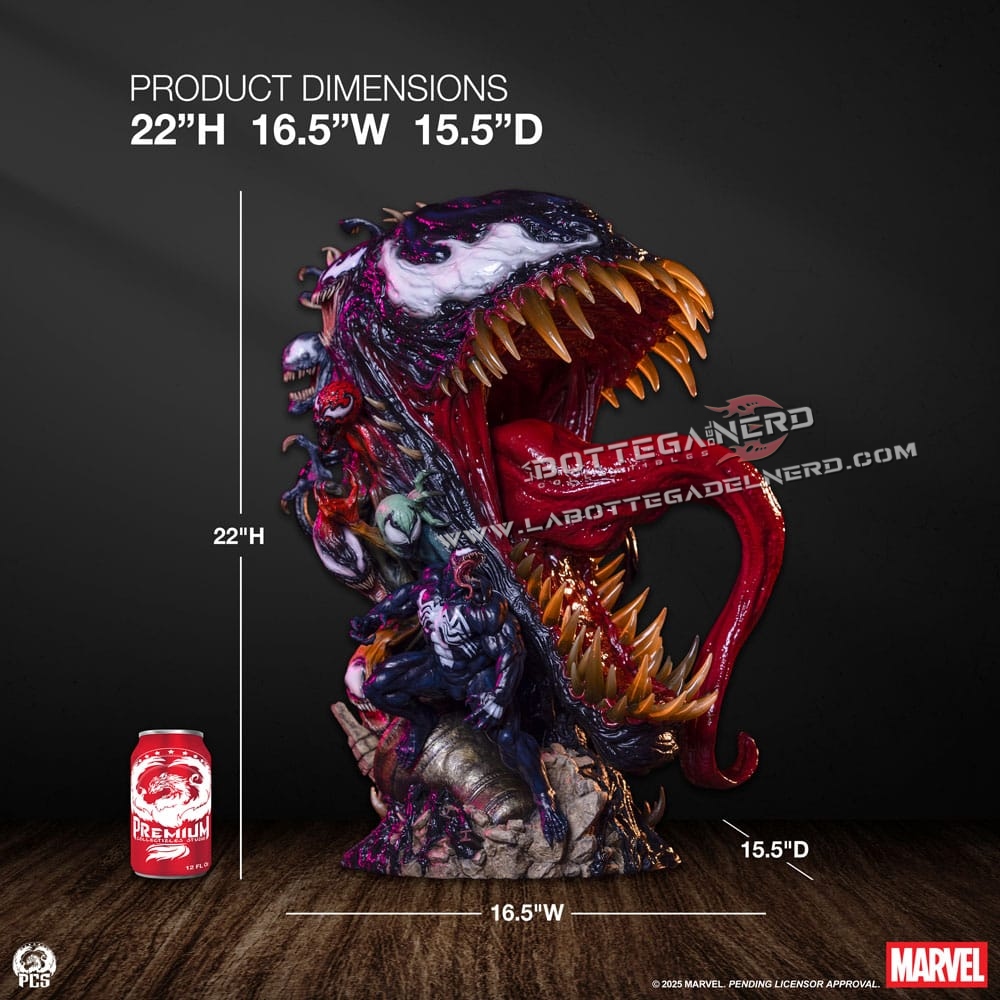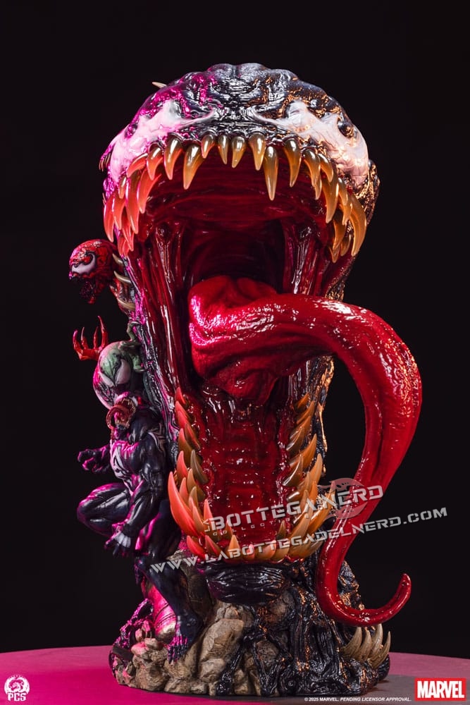 Al centro della scena si erge Venom, il famigerato anti eroe con la bocca spalancata in un urlo mostruoso, tra denti aguzzi e la lingua rossa che si protende minacciosa. Intorno a lui, un’incredibile composizione artistica rappresenta alcuni dei simbionti più celebri della saga: Carnage, Lasher, Scream, Phage, Riot e Agony, uniti in un vortice di materia aliena che circonda la base del busto. L’intera opera è completata da un’enorme campana, simbolo del punto debole del simbionte verso le onde sonore, che funge da trono scenografico per questo capolavoro.