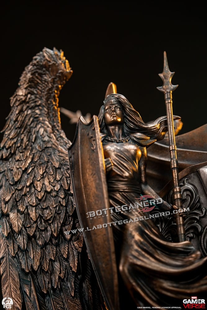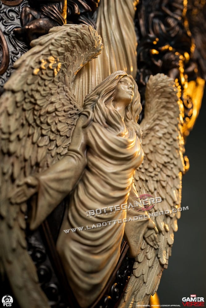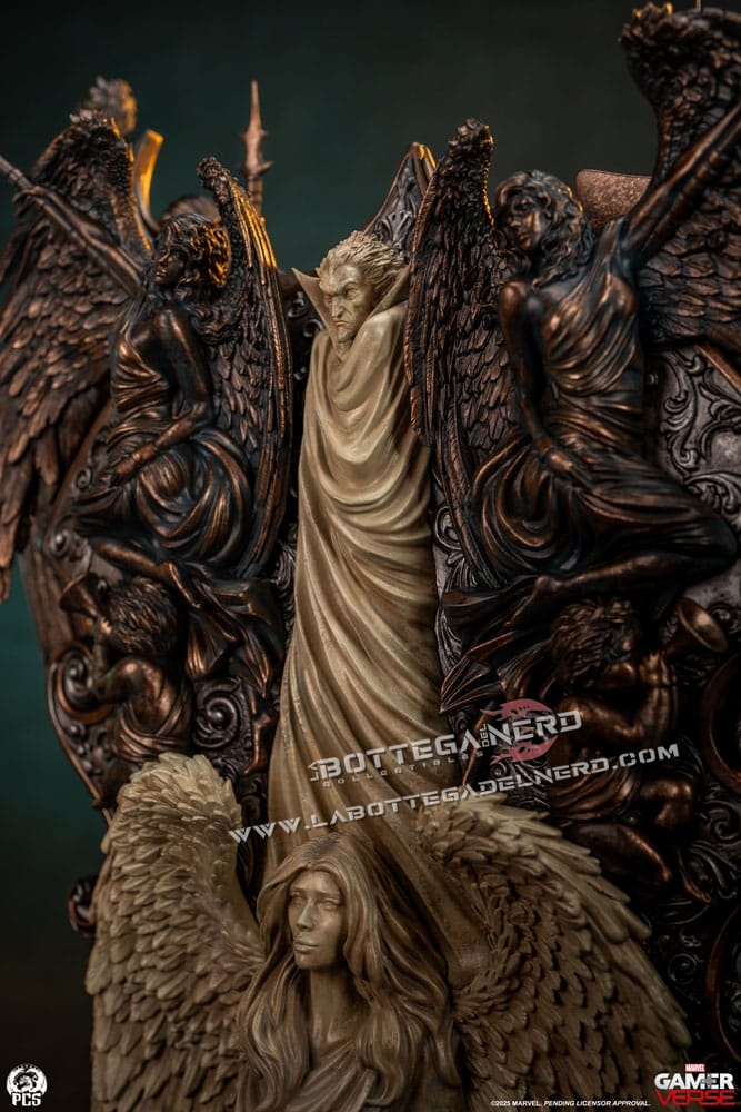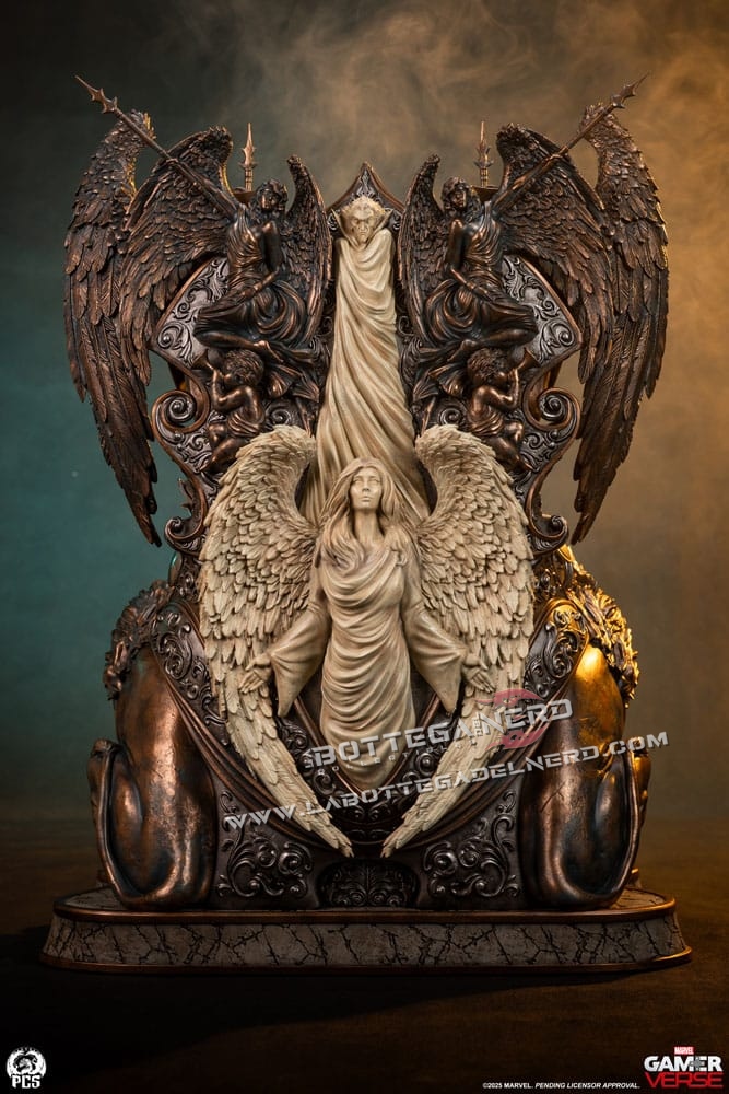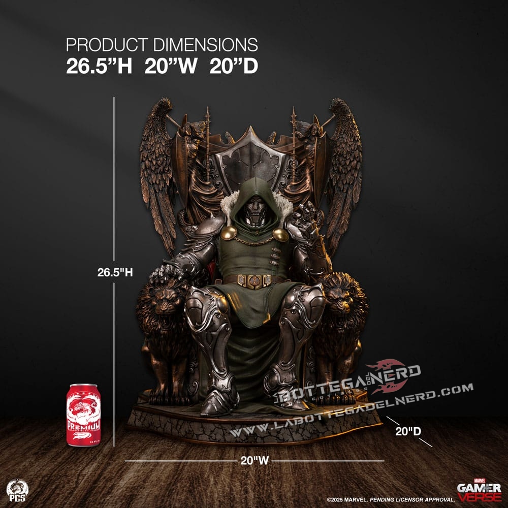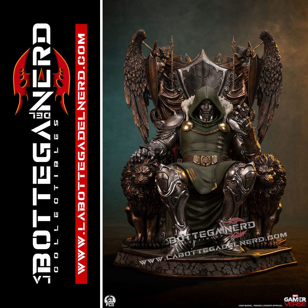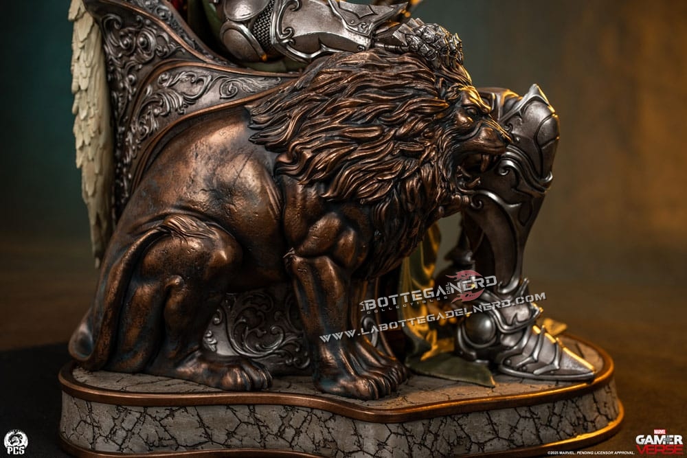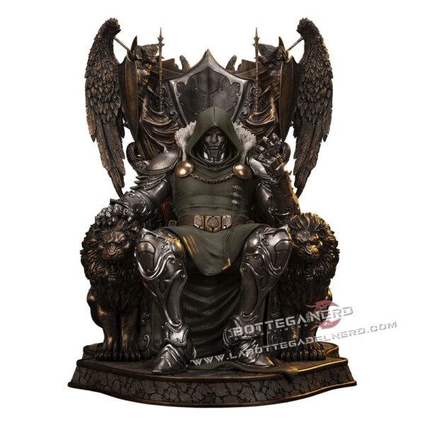 Il trono è una vera opera d’arte: ai lati spiccano due maestosi leoni scolpiti, mentre alle spalle di Doom emergono guerrieri alati con lance e scudi, rifiniti in un bronzo antico che dona un’aura sovrannaturale. Sul retro, figure in pietra invecchiata completano l’atmosfera epica e imperiale del pezzo. Un tributo al genio e all’arroganza di uno dei più grandi villain Marvel, destinato a dominare ogni collezione degna di questo nome.