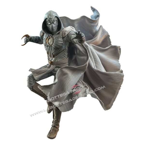 Il personaggio è raffigurato con il suo bianco costume, ampiamente snodato con 30 punti d’articolazione e alto 30 cm in totale. La figure è dotata di mantello in tessuto posabile, oltre ad alcuni accessori come le sue Lune Crescenti da lancio. Ad aggiungere valore troviamo anche un illuminazione a LED per gli occhi, ricreando il design completo del personaggio.