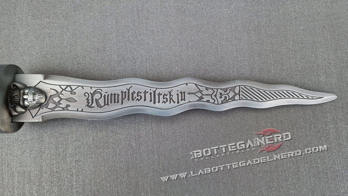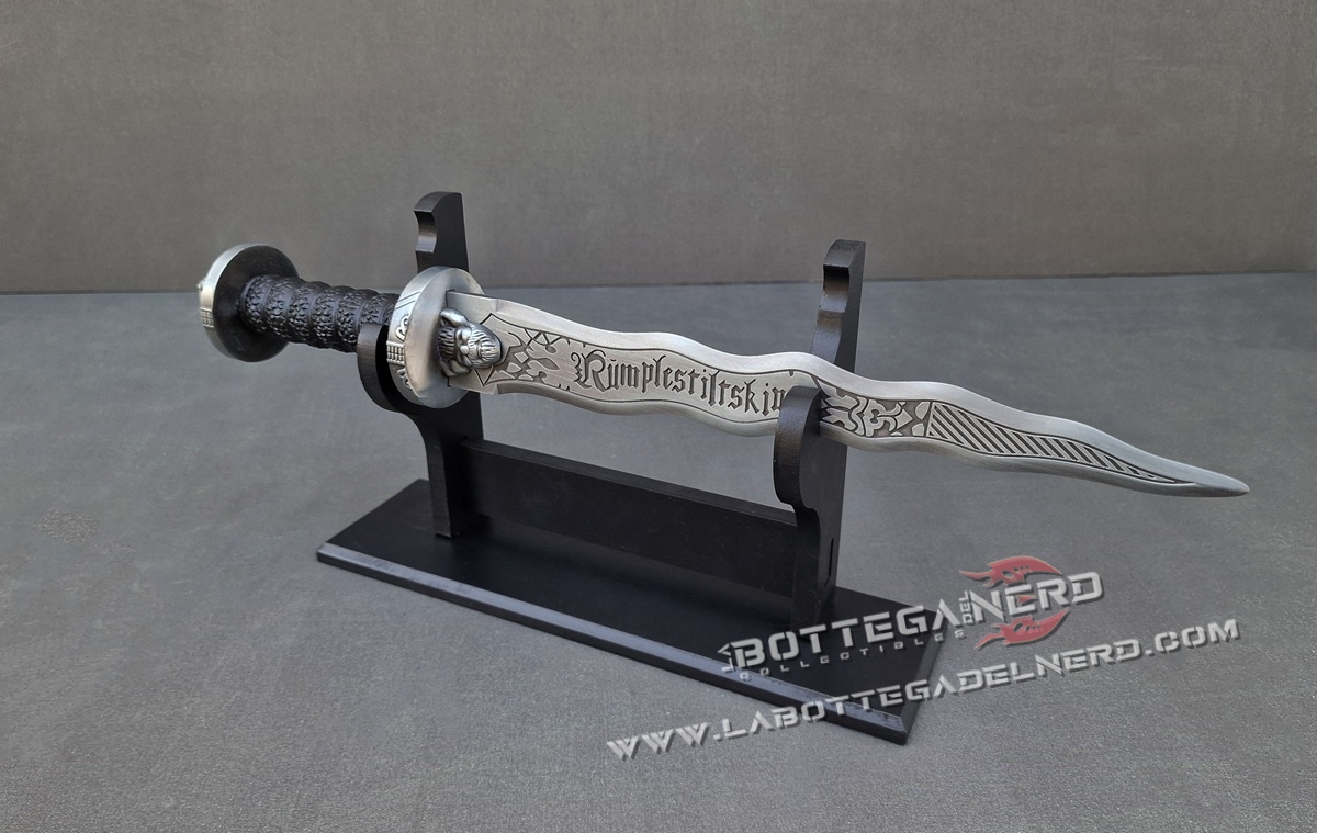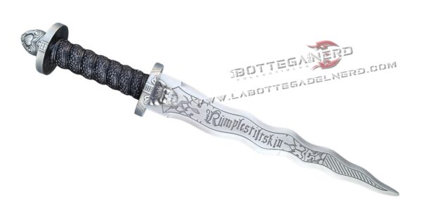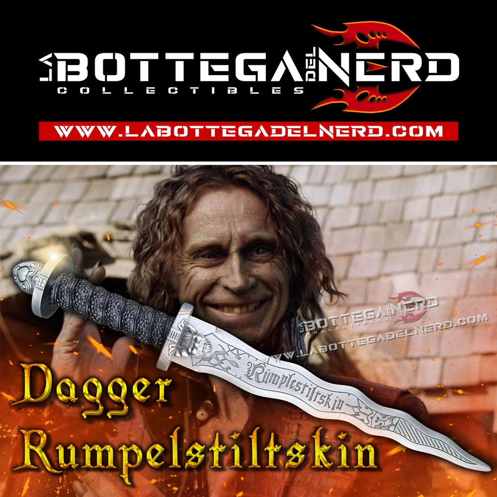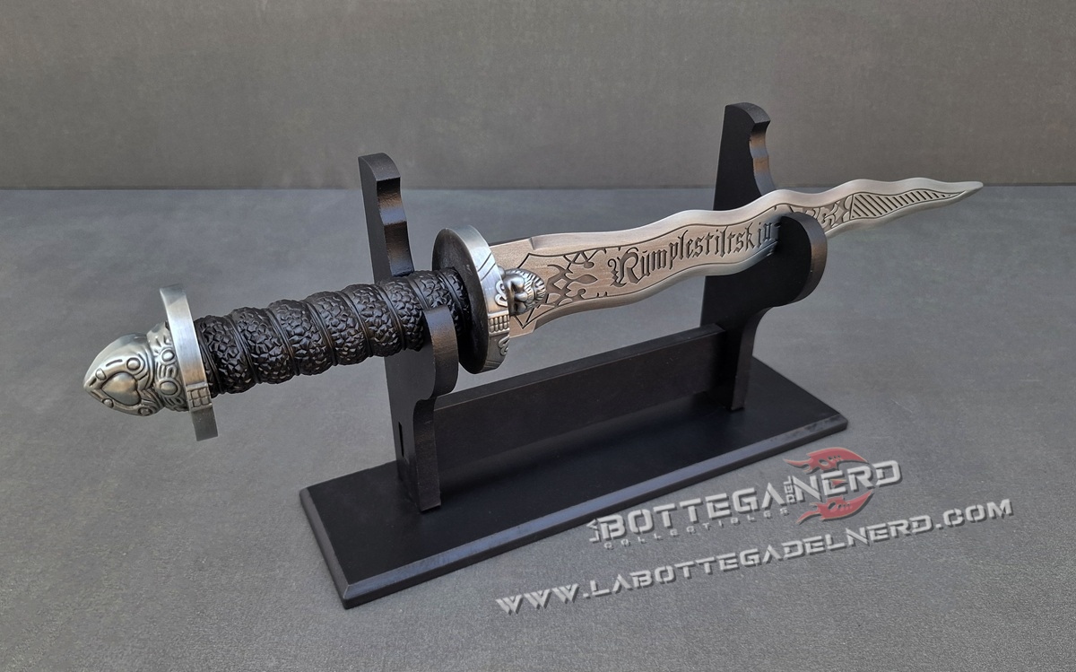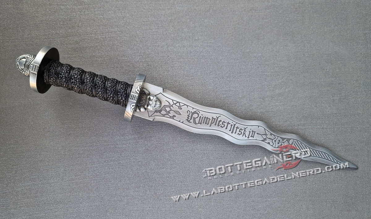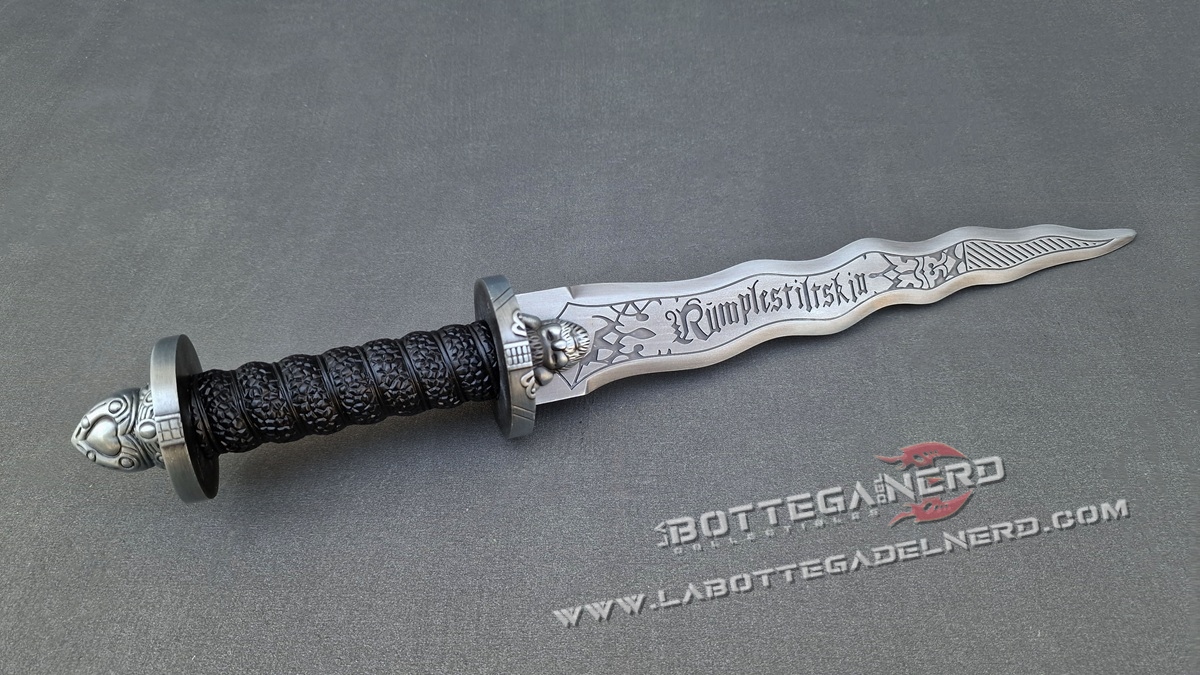 Questo pugnale ispirato a Rumpelstiltskin, iconico nella serie TV Once Upon a Time, misura circa 42 cm ed è pensato per fan, collezionisti e appassionati di cosplay. La lama e l’elsa riprendono fedelmente i dettagli visivi visti nella serie, con una finitura che richiama il metallo vissuto e forme che evocano il mondo magico e oscuro del Dark One.