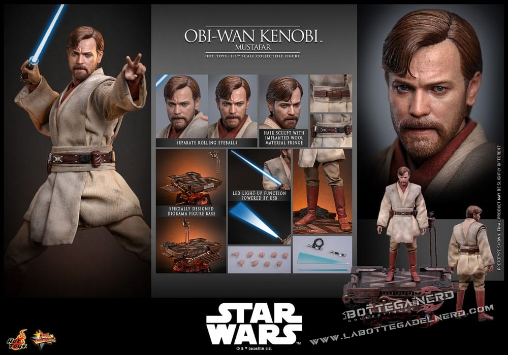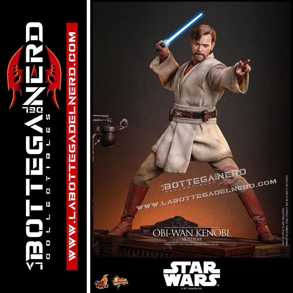 Hot Toys presenta la spettacolare action figure in scala 1/6 di Obi-Wan Kenobi (Mustafar), ispirata al drammatico duello finale di Revenge of the Sith. Alta 31 cm, riproduce alla perfezione le fattezze di Ewan McGregor, con occhi mobili, capelli impiantati in fibra e una straordinaria somiglianza realistica.
