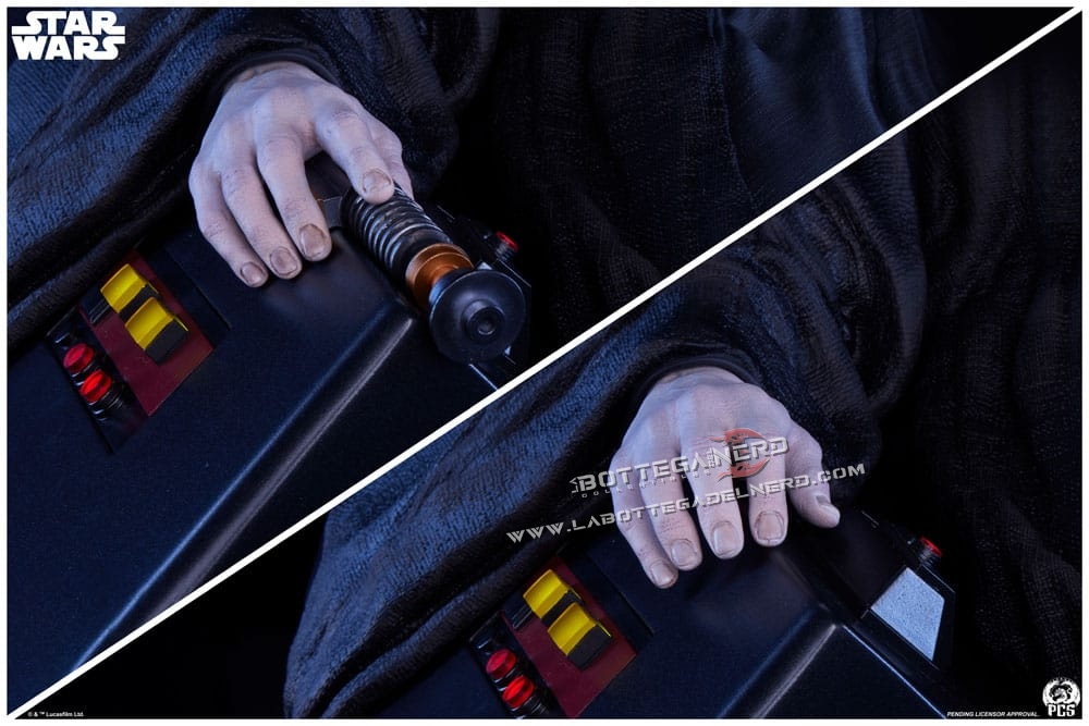 Il trono, finemente rifinito in nero lucido con inserti argento e pannelli di controllo su entrambi i braccioli, completa una scena di grande impatto visivo. La statua include inoltre una mano intercambiabile con la spada laser di Luke Skywalker, ricreando il momento più iconico de Il ritorno dello Jedi.