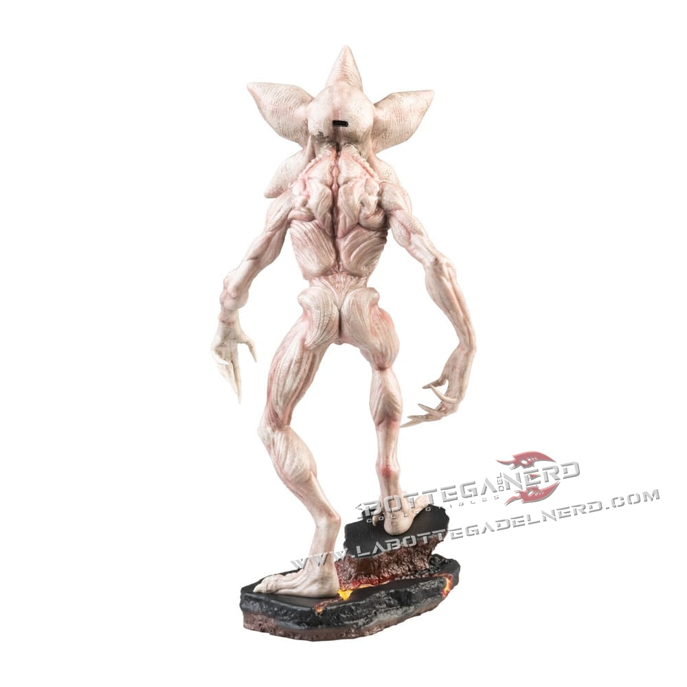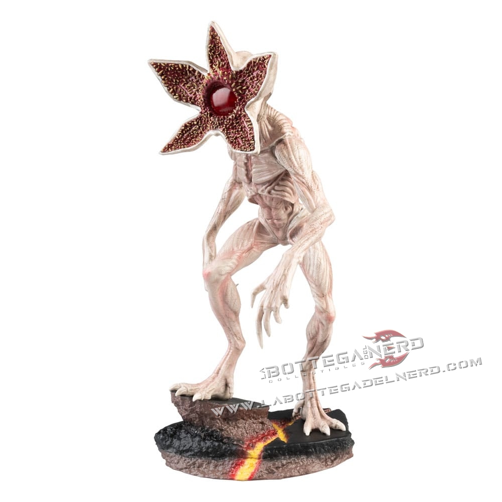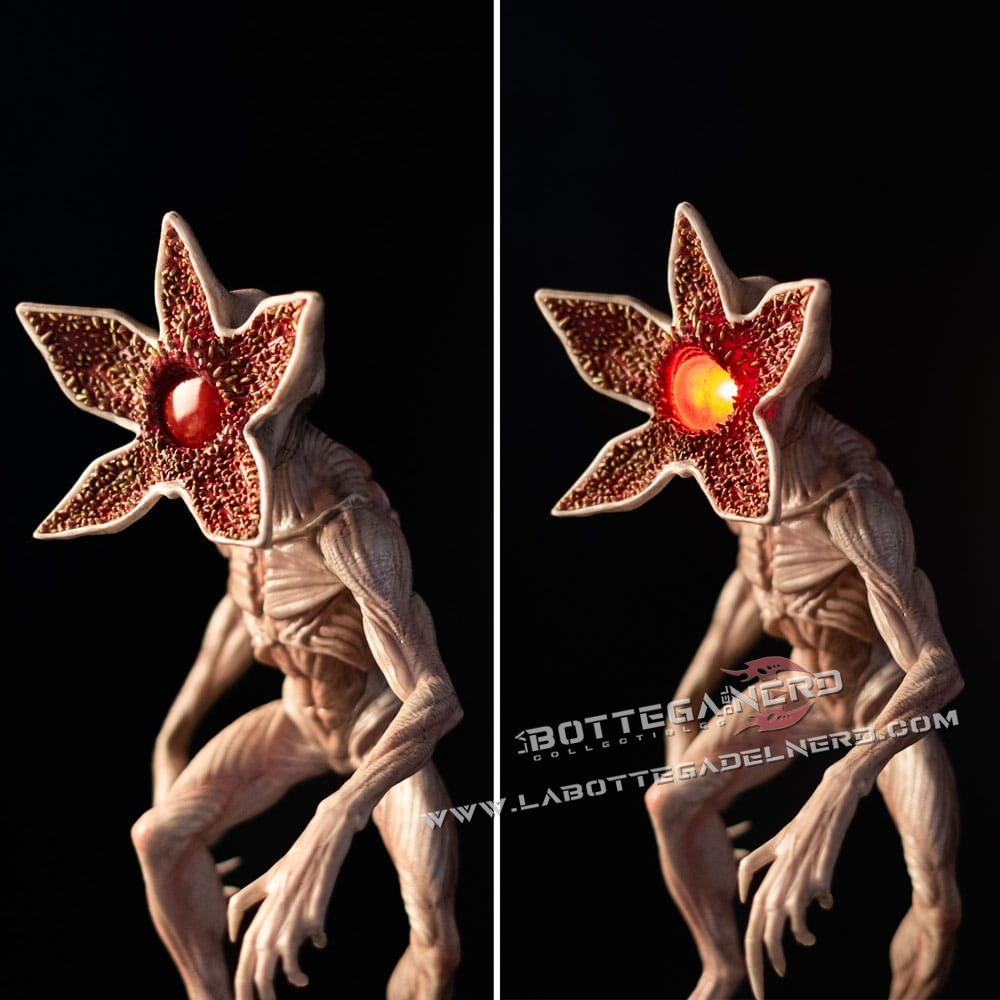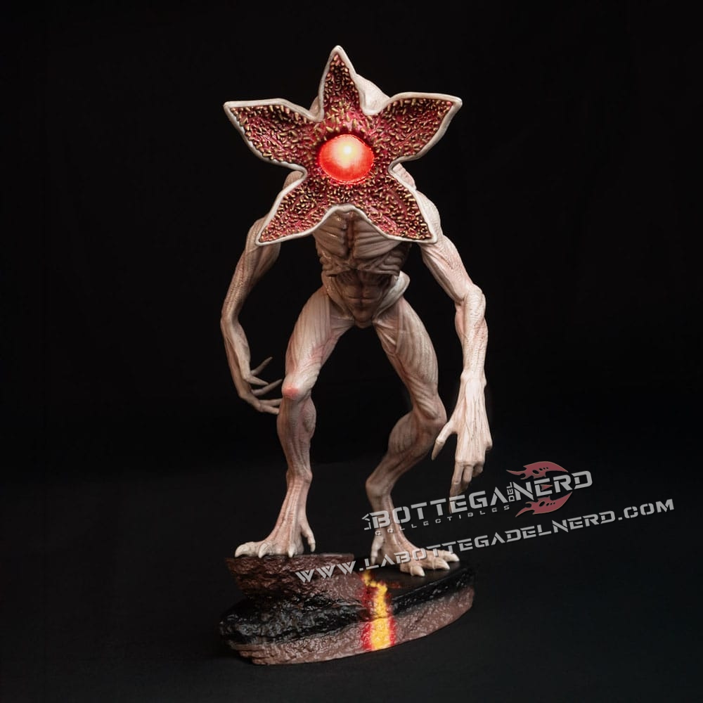 La scultura riproduce fedelmente il Demogorgone in posa minacciosa, con un livello di dettaglio elevato che valorizza la texture del corpo, la testa aperta a petali e la base scenica ispirata alle spaccature dimensionali.