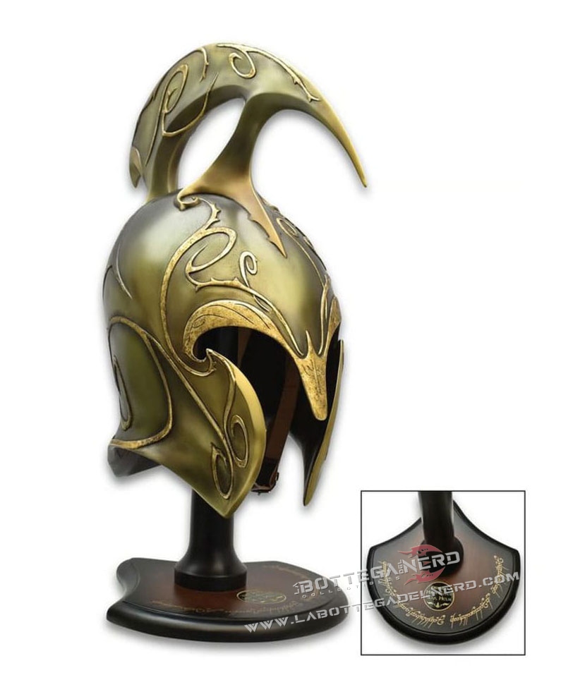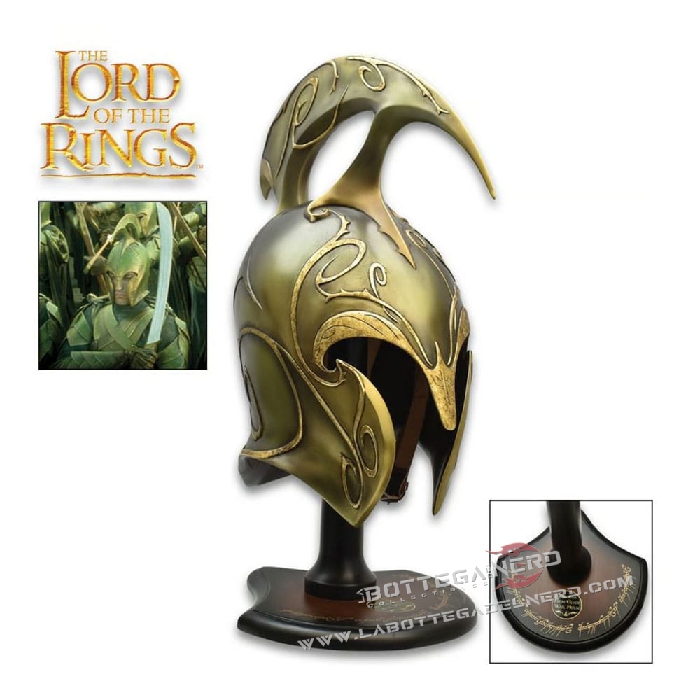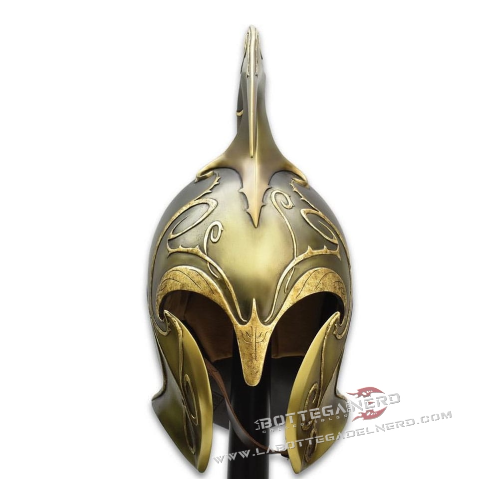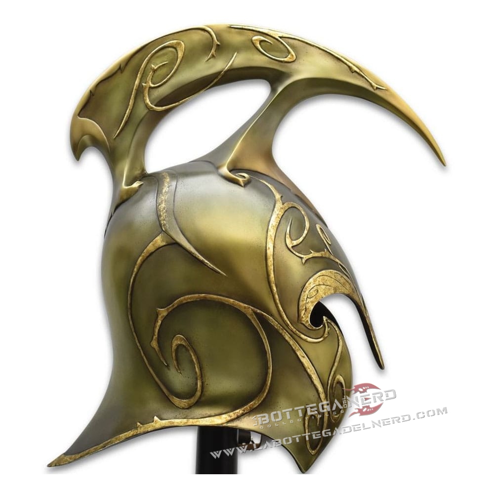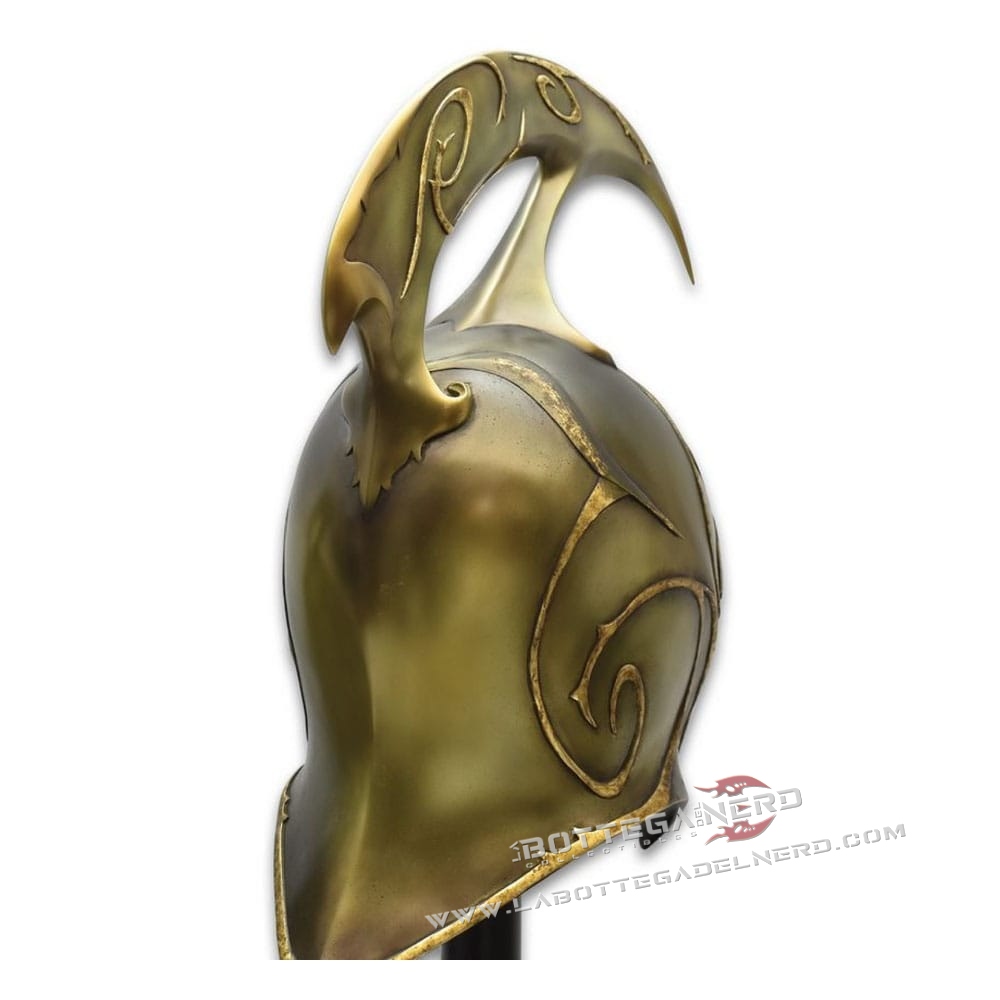 Realizzato in poliresina rinforzata, l’elmo presenta dettagli scolpiti con straordinaria precisione e una finitura che riproduce l’aspetto del bronzo antico, arricchito da motivi dorati e incisioni in rune elfiche.