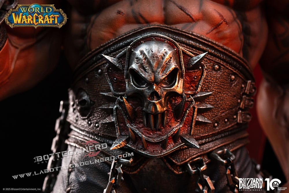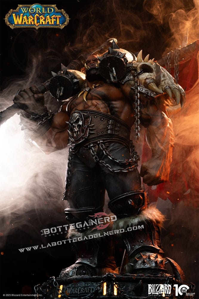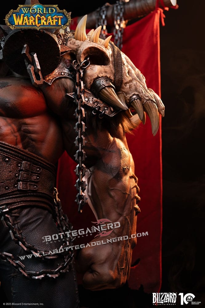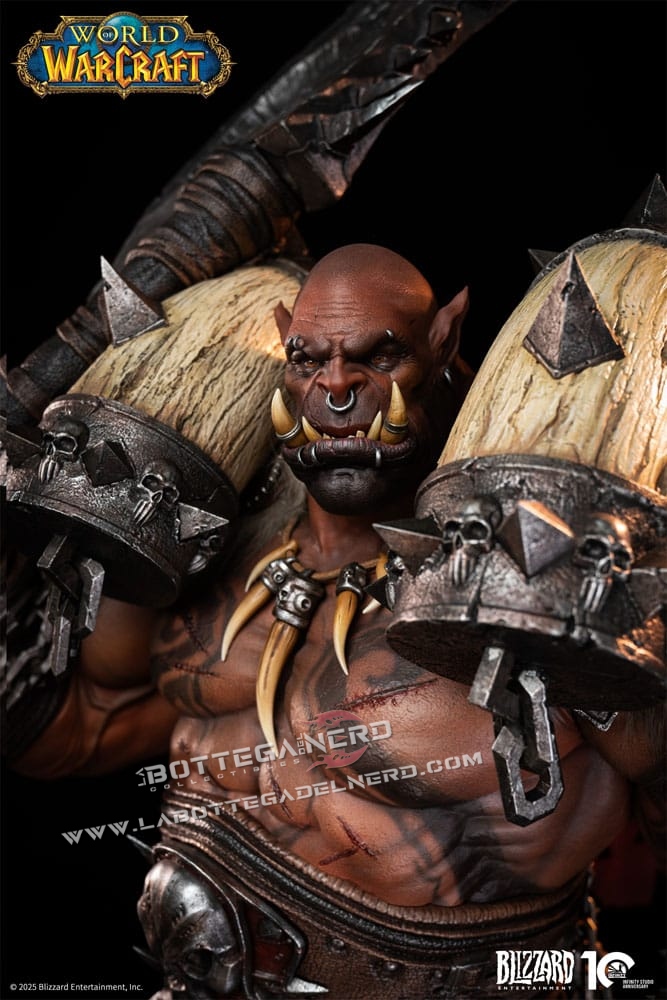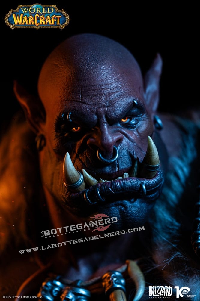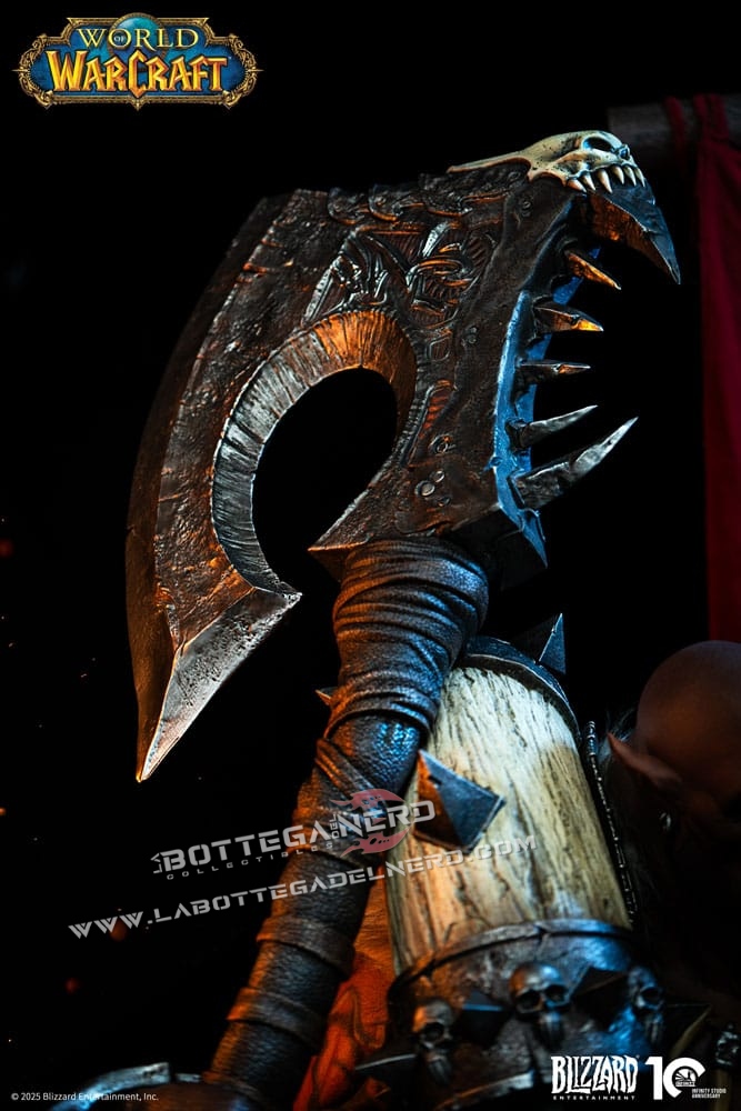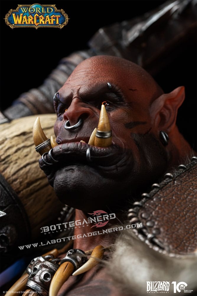 Il volto riproduce fedelmente i tratti degli orchi Mag’har, con occhi dorati illuminati da LED che intensificano lo sguardo. L’armatura, arricchita da elementi in pelliccia e ossa, mostra texture realistiche e tonalità naturali che evocano la brutalità e il carattere selvaggio del personaggio.