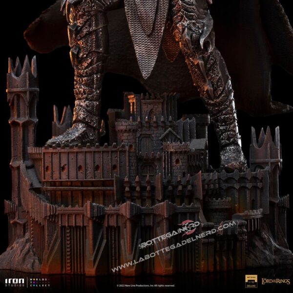La statua è basata sulla versione cinematografica ispirata al romanzo di Tolkien e vede Sauron mostrarsi in tutta la sua possanza, con una mano alzata pronto a colpire con la sua temibile mazza e con l’Unico Anello ben visibile sul dito indice.
