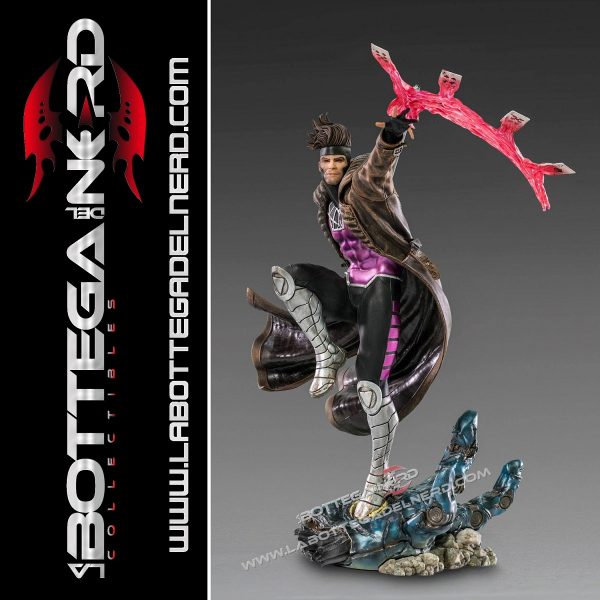 Gambit. Il Don Giovanni con la fissa delle carte da gioco è ovviamente ritratto in posa dinamica, mentre rilascia il suo potere scagliando una fila di 4 micidiali carte, che lasciano una scia rosa fluo. La statua è realizzata in scala 1/10 per un’altezza di 26 cm; ricordiamo che i pezzi acquistati singolarmente non potranno unirsi al diorama completo, per l’esposizione con la sentinella si dovrà acquistare il bundle completo.