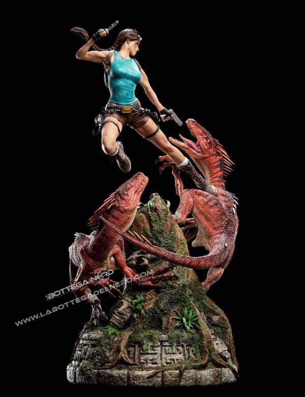 Come già descritto, Lara viene scolpita su una base imponente che raffigura delle rovine Maya, mentre combatte contro due velociraptor impugnando le inseparabili doppie pistole. I dettagli sono molto curati, dai rilievi delle rovine antiche sulla base, fino ai lividi visibili sul corpo dell’esploratrice. Il viso è teso per la concentrazione e tutta la scultura nell’insieme è molto dinamica.